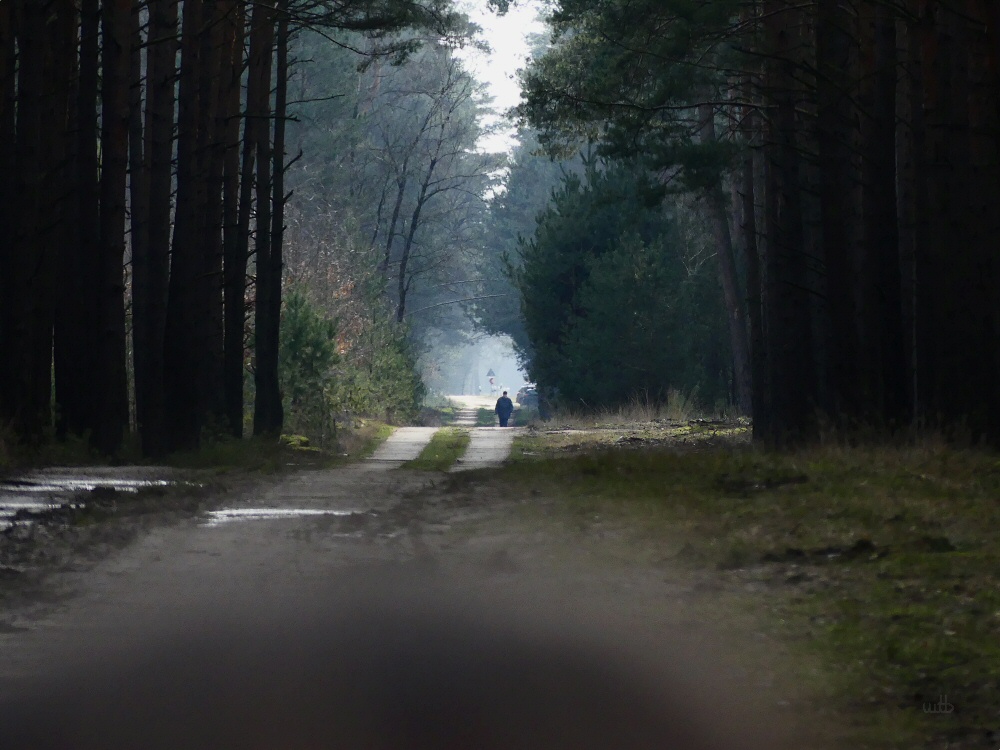 Vor uns ein sandiger Hügel im Sonnenlicht. Leider hatte es in der Nacht zuvor geregnet. Wir stehen; hören, daß wir hier praktisch im "Wohnzimmer" des grenzüberschreitenden Gartower Wolfsrudels (