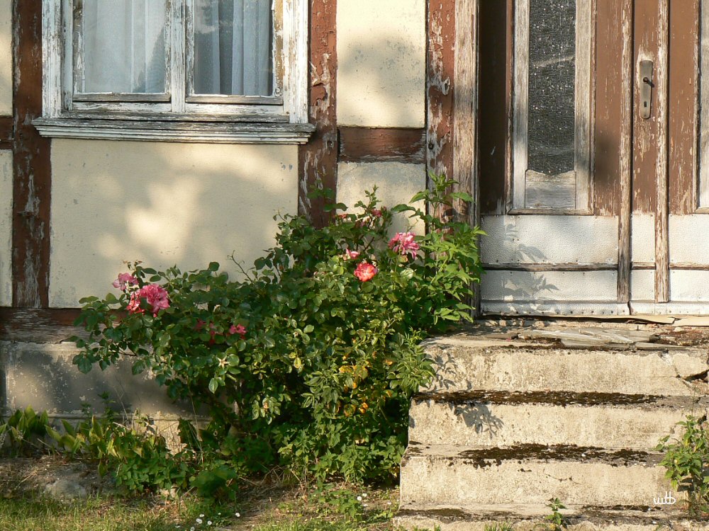 Noch ein Blick auf eine blühende Rose an einer Eingangstüre in der Nachbarschaft ...