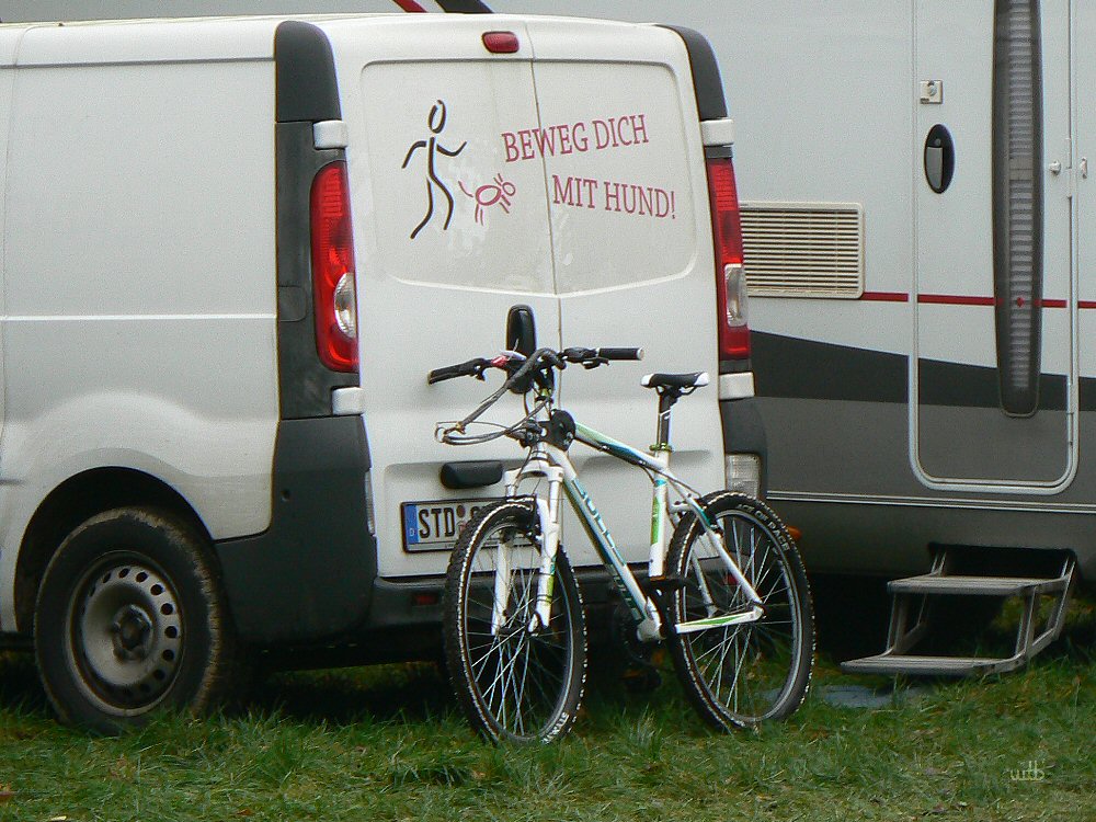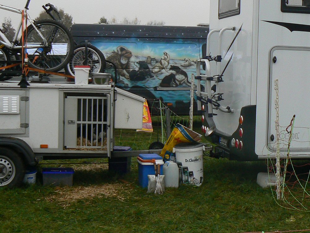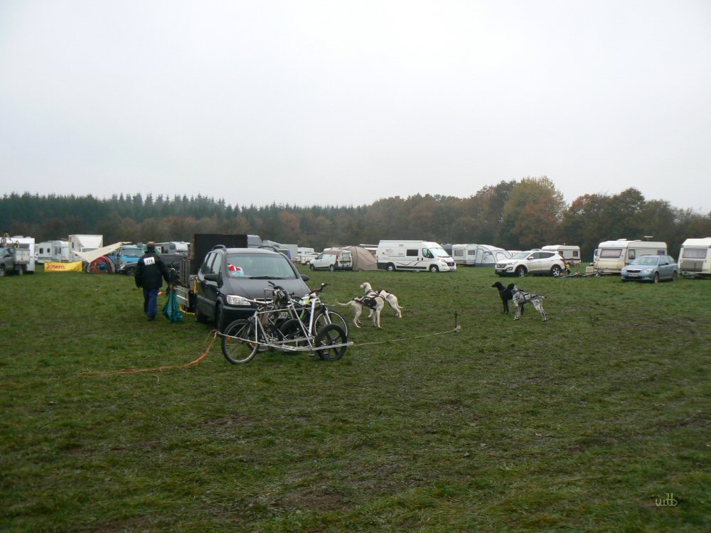 Auch neben dem Ziel stehen zwei und vier-beinige Sportler mit ihren Autos, Zelten, Wohnwagen..